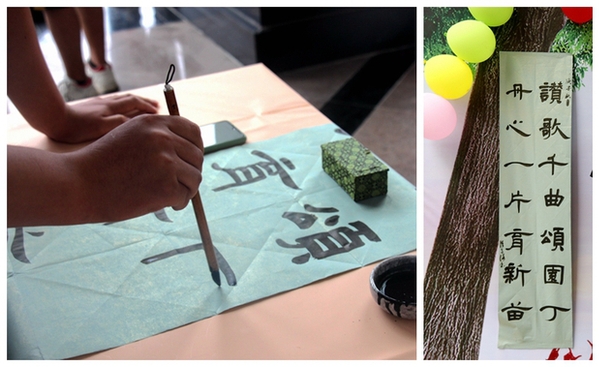 “老师,我是书法协会的负责人,从小练习书法,我能用自己的方式给老师们送祝福吗?”信管18302班的陈子诺自告奋勇道,一会儿功夫,在宣纸上就流淌出柔中带刚、韵味十足的隶书作品“丹心一片育新苗,赞歌千曲颂园丁”,引来旁边观摩的师生连连称赞。