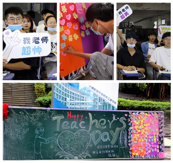 9月10日清晨,在凌峰楼A座大厅,计算机技术与软件工程学院分团委的志愿们早早就开始忙活了,布置黑板报、留言栏、签名墙、节日贺卡,用满满的惊喜等待着老师们的到来。“老师,节日快乐,我可以邀请您合影留念吗?”“老师,这是送给您的贺卡,您辛苦了!”祝福的话语和幸福的笑声不时响起。