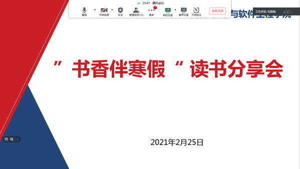 武职网讯(通讯员 毕忠宜)阅读经典,分享美好,让阅读成为一种习惯,以读书搭建学生发展平台。2月25日下午,计算机技术与软件工程学院历时4小时的“书香伴寒假”线上读书分享会在腾讯会议落下帷幕,计算机技术与软件工程学院党委书记刘昌喜、副书记闫升、辅导员代表以及学生发展对象、入党积极分子近90人全程参加了分享会。