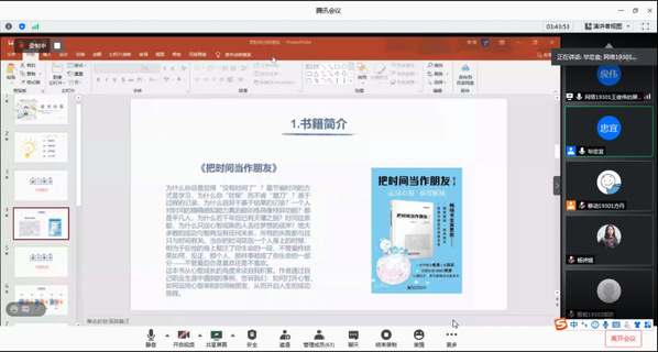 “我是带着在学习生活中的困惑去选择了这本书,读完后豁然开朗,更加理解了时间管理的意义,成功不是一蹴而就的,是一个积累的过程,要学会与时间做朋友,相信坚持的力量。”网络19301班王俊伟分享了阅读《把时间当做朋友》的感悟。
