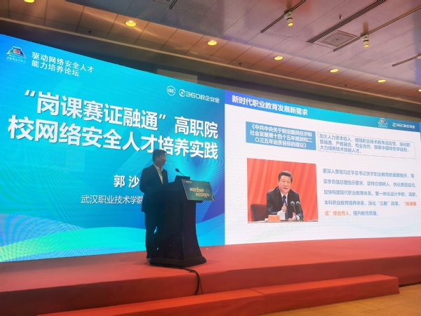 郭沙作为两所高校代表之一,以武汉职业技术学院在信息安全技能竞赛、军运会信息安全保障志愿服务、信息安全专业毕业生高质量就业及成立全国首家信创学院等人才培养实践成果作为案例,分享了学校深入贯彻落实全国职教大会精神和习近平网络强国战略思想,坚持以人为本,探索“岗课赛证”融通的综合育人长效机制,培养高职院校网络安全人才的经验做法。