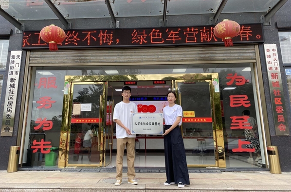 7月7日,实践团队来到天门市竟陵街道新城社区居民委员会,与新城社区居委会主任王一淇交流座谈,并为武汉职业技术学院“大学生社会实践基地”进行授牌。