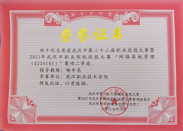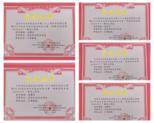 (通讯员 彭求明) 近日,从武汉市第22届职业技能大赛暨2021年武汉市职业院校技能大赛“网络系统管理”赛项组委会传来捷报,我校计算机技术与软件工程学院选派师生团队参加此赛项的角逐,共夺得7个奖项,其中,一等奖1项、二等奖1项、三等奖5项。