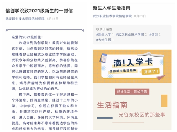 信创学院微信公众号推送“给信创学院新生一封信”、光谷东校区校园生活指南