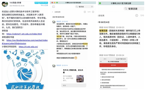 早在8月份,计算机技术与软件工程学院、信创学院的师生就开始筹备新生线上答疑工作,该院团学干部更是认真细致地整理出关山校区和光谷东校区的入学指南和报到流程,并在微信公众号、QQ群上同步推送。