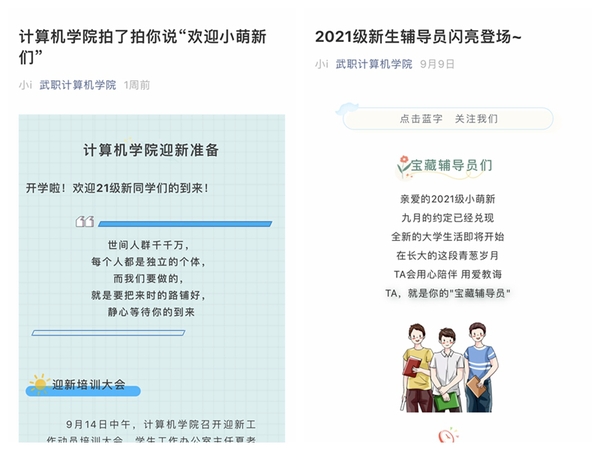 该院微信公众号也同步推送了计算机学院“武职印象”征文活动,鼓励新生用文字描述对武职的印象,记忆深刻的温暖瞬间,发生在身边的小故事以及对未来的畅想。