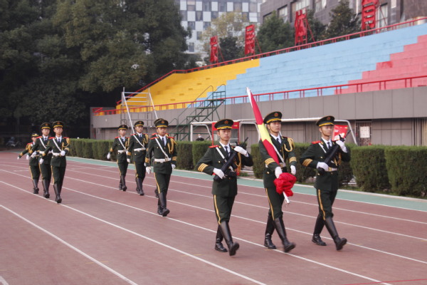上午6时50分,铿锵有力的脚步声在田径场边响起,现场师生屏气凝神,将目光投向国旗仪仗队走来的方向,国旗仪仗队挺拔威武,迈着铿锵有力的步伐护送鲜艳的五星红旗入场。