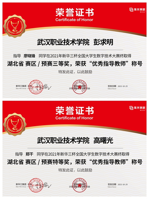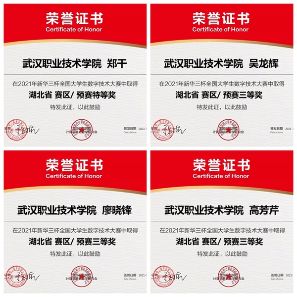武职网讯(通讯员 彭求明) 2021年“新华三杯”全国大学生数字技术大赛湖北省赛区预赛结果近日揭晓,武汉职业技术学院代表队选手郑干荣获特等奖并晋级全国总决赛(个人赛),吴龙辉、廖晓锋、高芳芹获三等奖,郑干与吴龙辉、廖晓锋将组队参加全国总决赛(团队赛)。高曙光、彭求明获“优秀指导教师”称号。