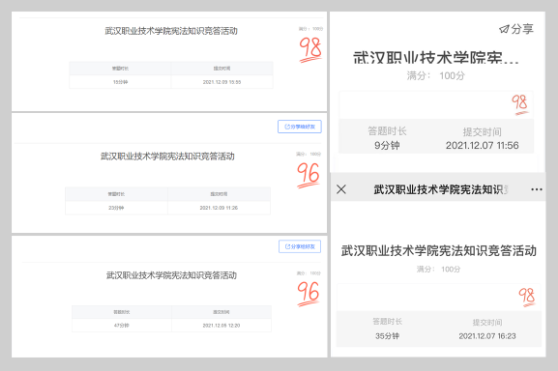 学院组织全院教职工,以工会小组为单位,学习习近平新时代中国特色社会主义思想,特别是习近平法治思想的相关内容,学习党的十九届六中全会精神、党的十八大以来在法治建设取得的辉煌成就、社会主义核心价值观、《中华人民共和国宪法》和疫情防控等相关法律规范,教职工通过参加关注武汉职业技术学院官方微信公众号,参与宪法知识答题。