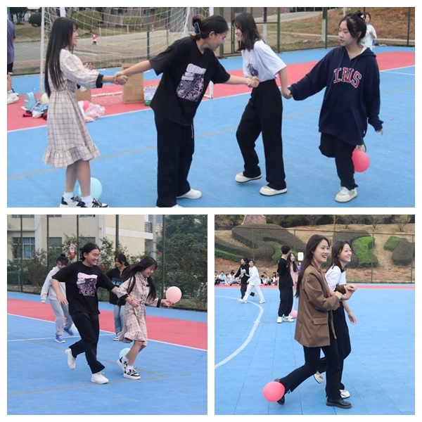在“释放压力”游戏中,将参与学生随机分为若干小组,每个小组发一个气球,小组成员要通过相互合作,保护自己团队的气球不被踩破。学生在游戏过程中释放了压力,培养了的团队意识,增进了彼此情感。