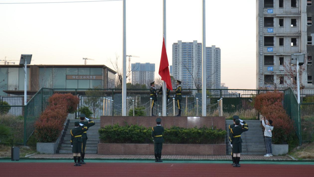 上午6点50分,升旗仪式正式开始。国旗仪仗队坚挺着向前驶来,护送鲜艳的五星红旗入场。他们昂首挺胸,随着国歌声的响起,全体学生注视着鲜艳冉冉升起的五星红旗,随风飘扬。