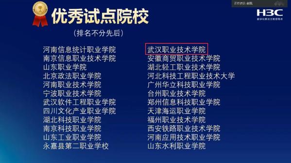 职网讯(通讯员 陈觎3月25日上午,教育部第三批1+x证书制度职业教育培训评价组织新华三集团2022年度1+X试点工作总结表彰及2023年度工作说明会在云端举行。本次会议上,新华三集团对2022年度1+X工作开展中的优秀院校进行了表彰,武汉职业技术学院荣获2022年度“1+X大数据平台运维职业技能等级证书优秀试点院校”荣誉称号。