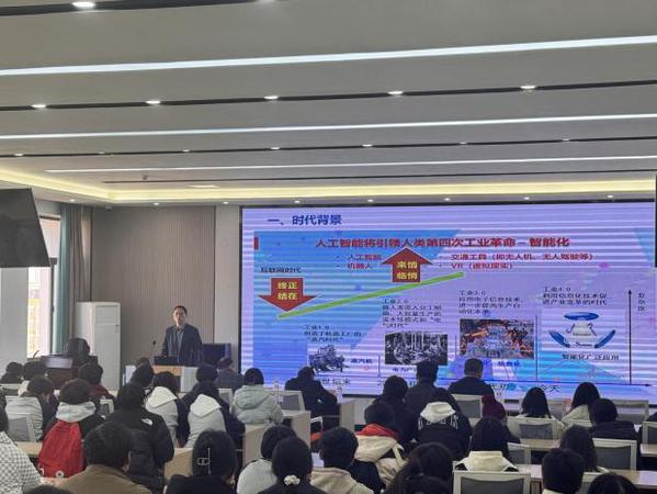 参观结束后,人工智能技术教研室主任高源围绕“人工智能发展与应用”,为学子们带来了题为《人工智能技术革命与职业未来》的科普讲座,他通过详实的数据和生动的案例,介绍了人工智能技术在机器学习、深度学习、自然语言处理等领域的突破性进展,展示了人工智能技术在智能制造、智慧城市、智慧医疗、金融科技等行业中的创新应用,带领学子们在轻松愉悦的氛围中,感受“人工智能+”为我们描绘出的更加智能、高效、绿色的美好生活蓝图。