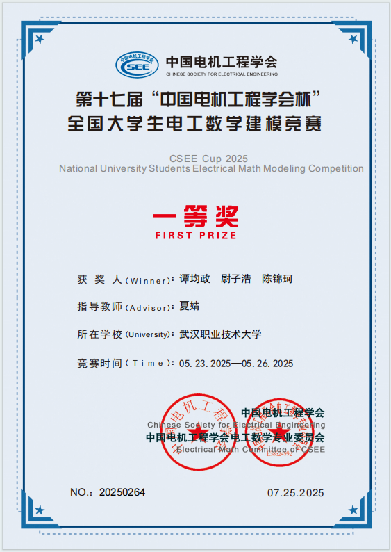 新闻网讯(通讯员 夏婧)近日,从第十七届“中国电机工程学会杯”全国大学生电工数学建模竞赛组委会传来喜讯,武汉职业技术大学大数据24302尉子浩、人工智能24301陈锦珂、电信23301谭均政组成的参赛团队,从众多参赛队伍中脱颖而出,荣获大赛一等奖。