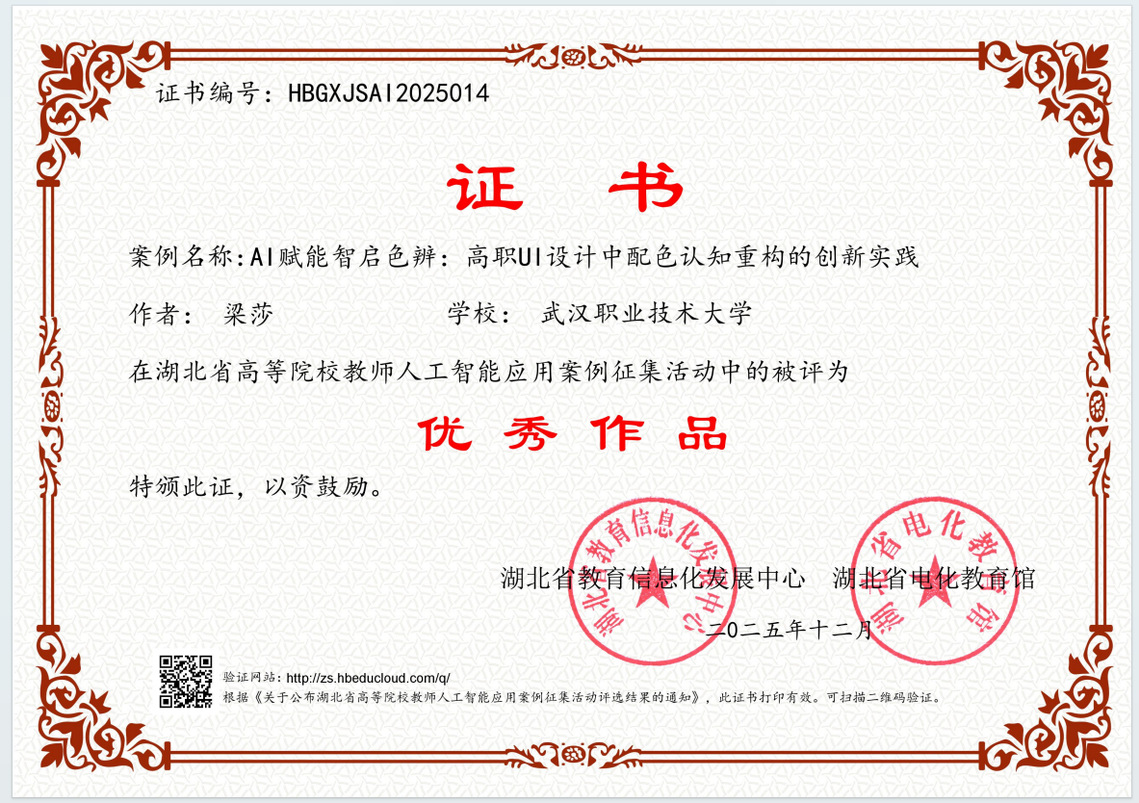 新闻网讯(通讯员 蔡晖)12月23日,湖北省教育厅公布2025年度高等院校教师人工智能应用案例征集活动评选结果。武汉职业技术大学人工智能学院(信创产业学院)专任教师梁莎提交的案例《AI赋能智启色辨:高职UI设计中配色认知重构的创新实践》获评“优秀作品”,并被推荐至教育部教育技术与资源发展中心(中央电化教育馆)参与全国交流推广。