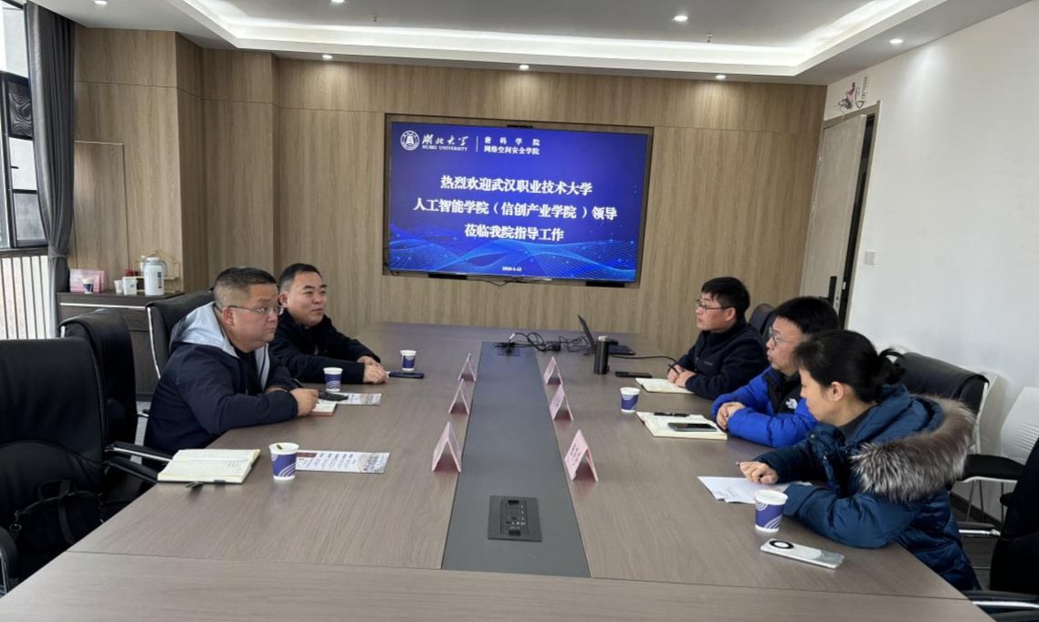 新闻网讯(通讯员 项阳阳、赵德宝)为深化校际合作、整合优质资源,1月12日,人工智能学院(信创产业学院)副院长邓小飞一行赴湖北大学网络空间安全学院调研交流。湖北大学网络空间安全学院书记肖志华、副院长何鹏、张莎莎热情接待,双方围绕科研共建与人才协同等达成重要共识。