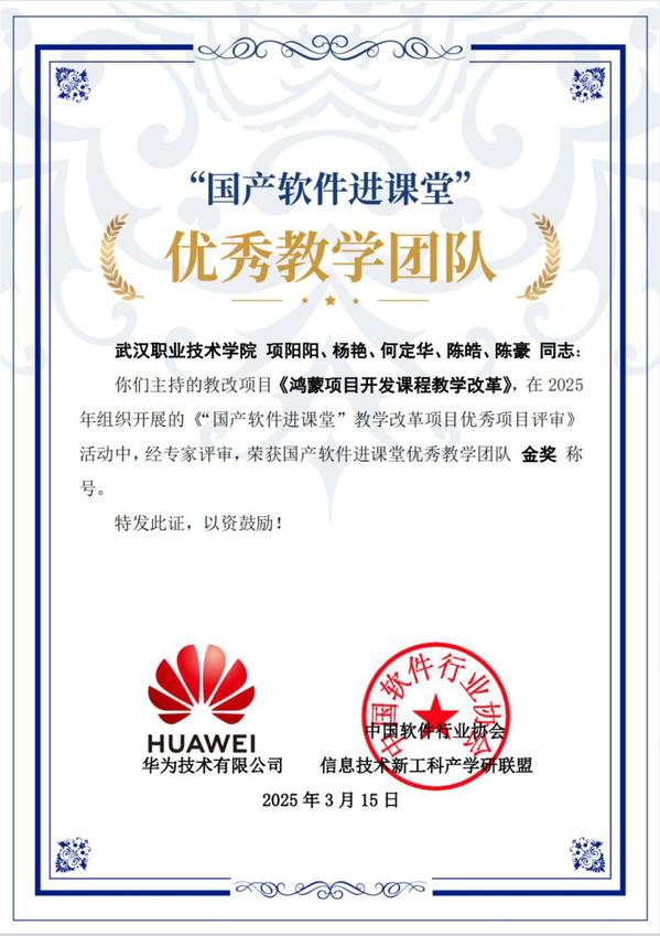 作为湖北省首所公办职业本科学校、国家“双高计划”建设单位,武汉职业技术大学始终坚持以高质量职业教育服务国家战略和区域经济社会发展,聚焦新一代信息技术和数字经济前沿。近年来,学校积极响应信创产业布局,主动融入国产操作系统生态建设,在课程体系、实训平台和师资队伍等方面持续发力。学校建成“鸿蒙工坊”,开设《鸿蒙移动APP项目实训》《鸿蒙项目开发》《鸿蒙分布式开发实训》等特色课程,并与多家头部企业共建“双师型”教学团队,推动教学内容与产业技术同步迭代。2025年,学校鸿蒙教学团队获“国产软件进课堂”优秀教学团队“金奖”称号,“愈见”项目成功入选光谷人才种子基金鸿蒙生态首批项目。