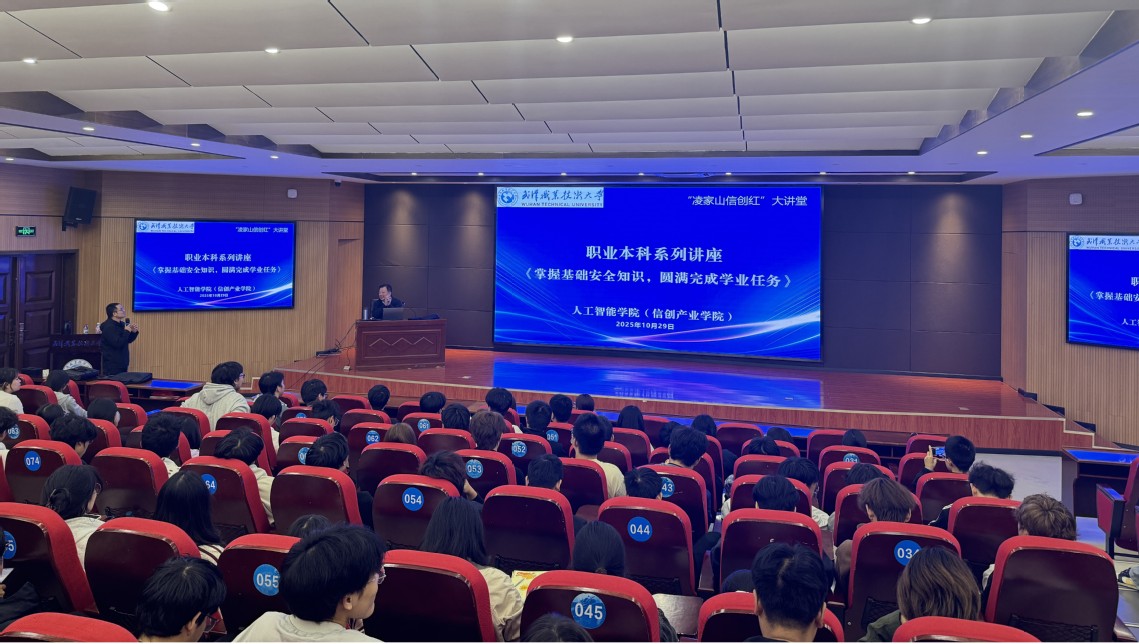 首期讲堂由人工智能学院(信创产业学院)院长易海胜主讲《人工智能的前世今生》,从图灵测试讲到国产AI芯片突围与原创算法等“卡脖子”难题,引导学生思考“技术为谁而用”;第三期特邀中南财经政法大学安全工程领域专家姜威教授,聚焦校园安全防线建设,强化学生安全意识;第四期联动武鄂同城司法资源,通过真实案例解析法律条文,帮助青年筑牢规则意识;第五期由学院副院长邓小飞深度解读信创国产化浪潮下的考研与就业新机遇,激发学子投身关键核心技术攻关的使命感。每一场讲座,都紧扣“为党育人、为国育才”初心,让红色基因在技术人才成长中深深扎根。